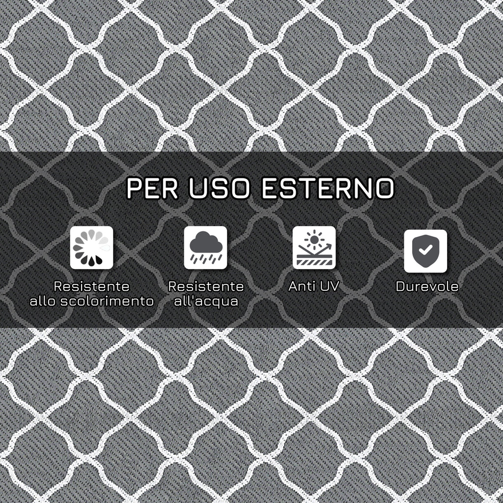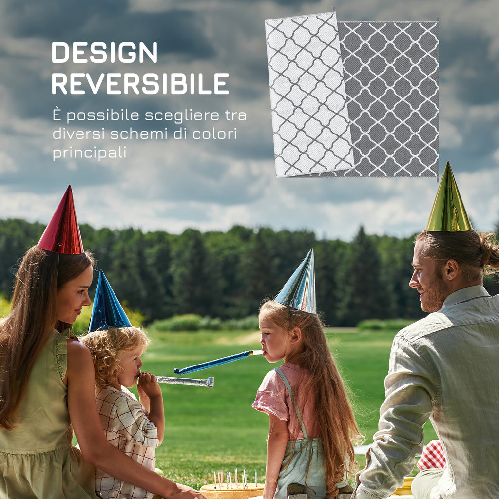 Il tappeto da esterno, impermeabile e resistente, è perfetto per ogni momento all'aperto. Ideale per campeggi, picnic o giardini, basta piegarlo e inserirlo nella borsa di trasporto inclusa per portarlo senza fatica con te. È resistente agli strappi e all'acqua, e ha un design reversibile che ti consente di utilizzarlo dal lato che preferisci! Tappeto da esterno adatto per campeggio, picnic, giornate al parco ecc.. Facile da ripiegare e trasportabile ovunque desideri. Design reversibile, entrambi i lati del tappeto da giardino possono essere utilizzati. Realizzato in polipropilene, con un rivestimento protettivo per evitare lo sbiadimento e i danni causati dal sole. Sacca per il trasporto inclusa.