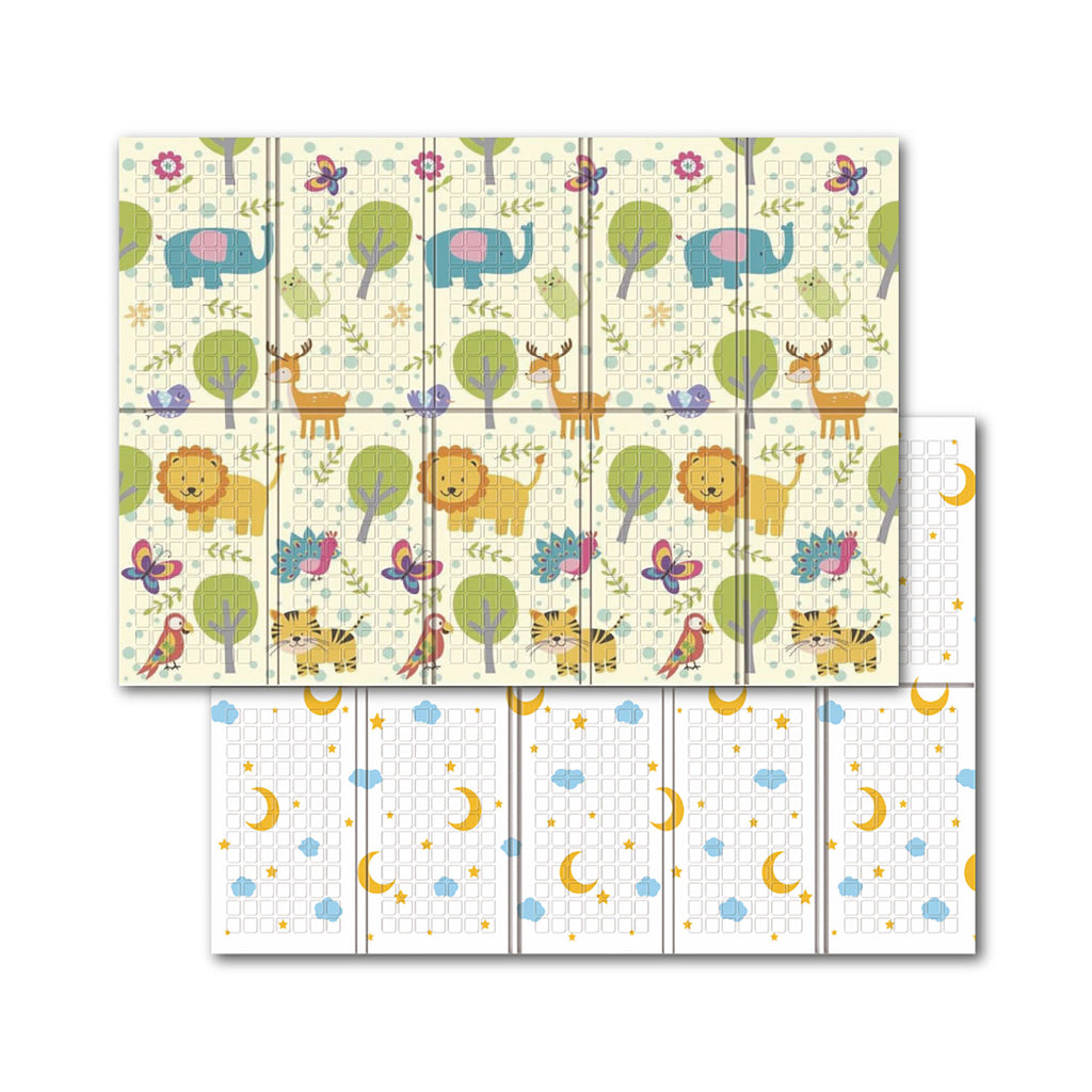 Il design doppio del Tappeto Pieghevole Cloudy è pensato per stimolare la curiosità e l'apprendimento dei bambini. La grafica con gli animali della savana, ricca di colori e dettagli, introduce i più piccoli al mondo della natura in modo divertente ed educativo. Elefanti, leoni, cervi e tanti altri amici aspettano solo di essere scoperti! L'altro lato del tappeto, con il suo cielo stellato e le nuvole soffici, crea un'atmosfera rilassante e sognante, perfetta per la nanna o per momenti di coccole. Questo tappeto pieghevole è molto più di un semplice oggetto: è un invito all'esplorazione e alla scoperta, un compagno di giochi che accompagnerà i tuoi bambini in mille avventure.
