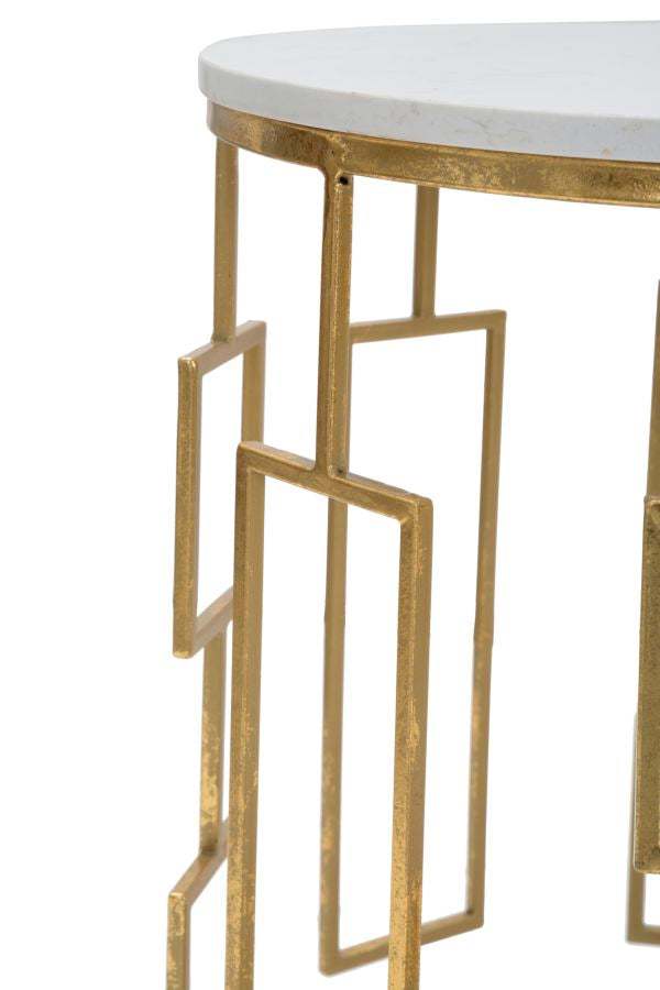 Paire de tables rondes en métal doré avec plateau en marbre blanc. Les décorations géométriques qui composent la base donnent une touche de raffinement à n'importe quel environnement.