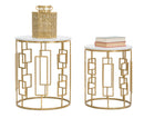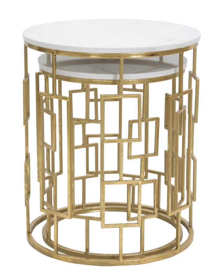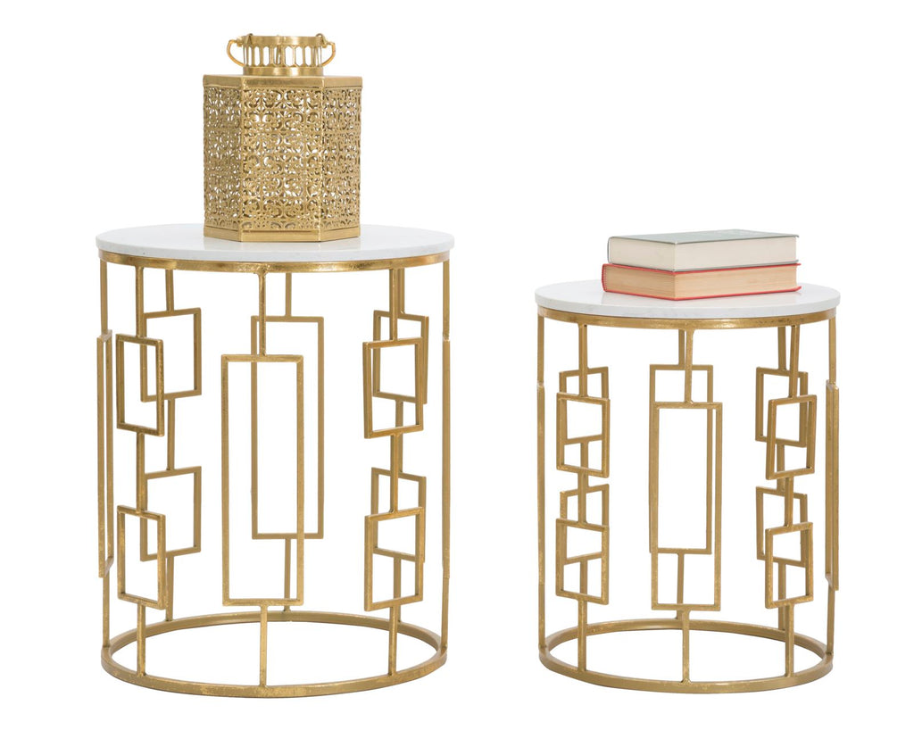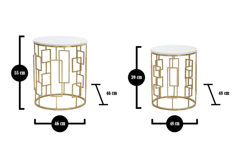 Paire de Tables Basses Cube Ø46x55-39x48 cm en Fer et Or et Marbre Blanc