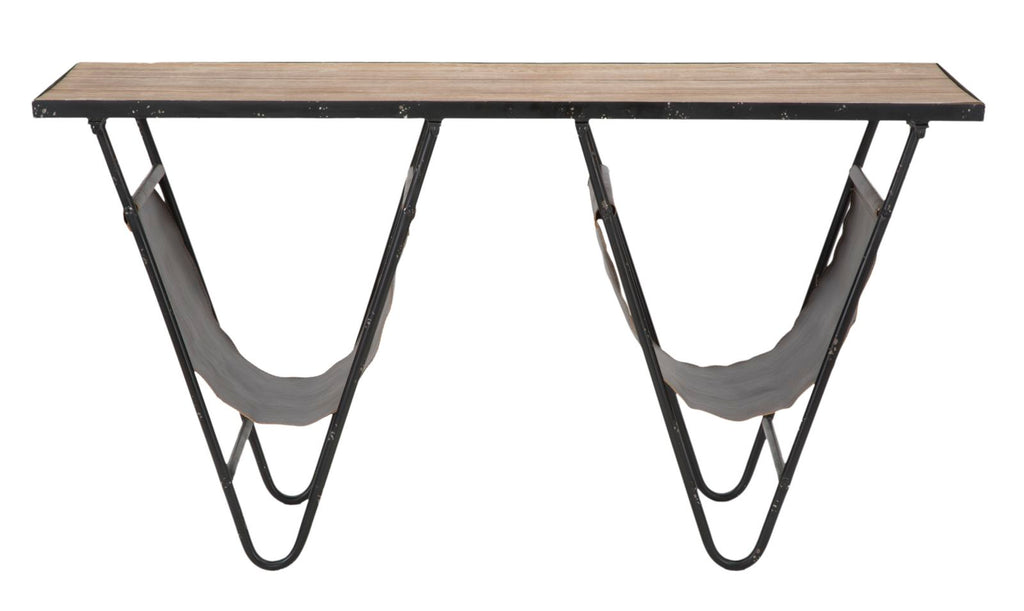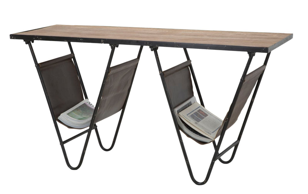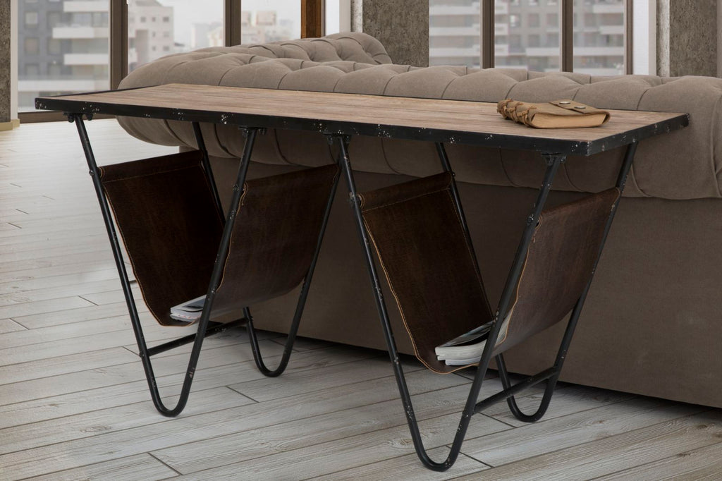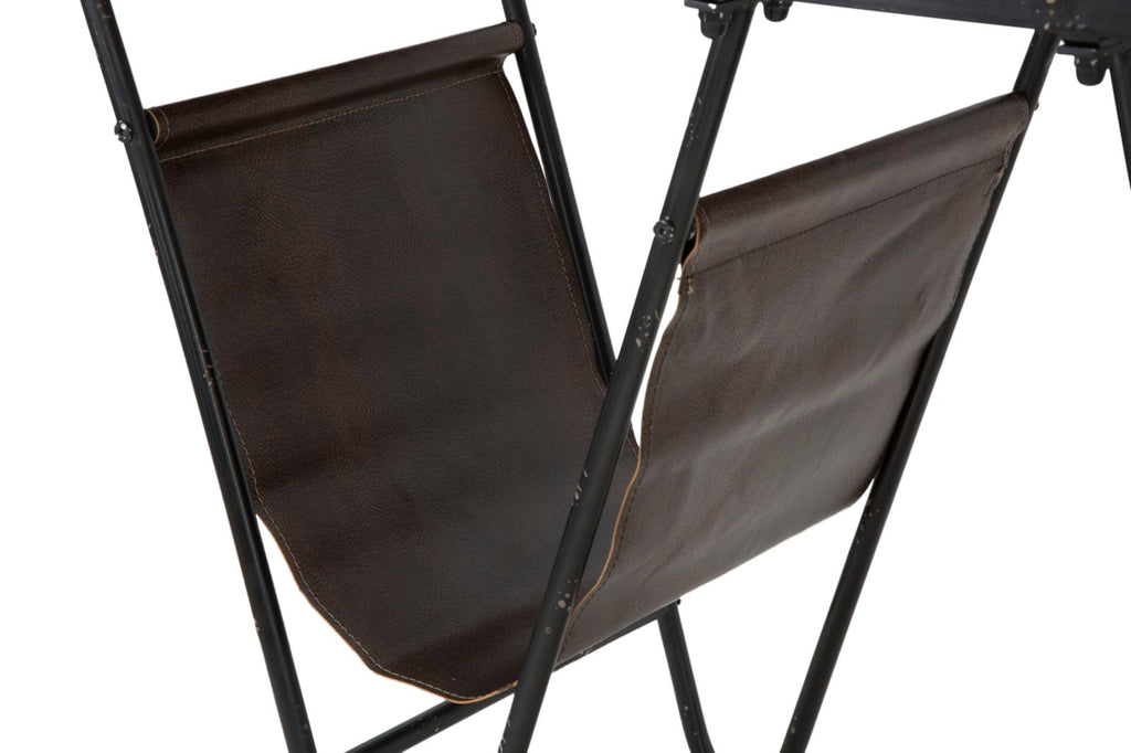 Table à journaux "V" 120x43x62,5 cm en fer et bois de sapin et PU noir et marron