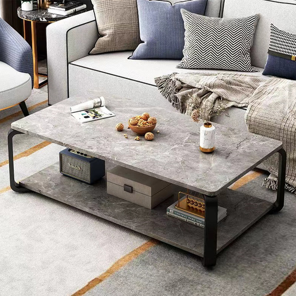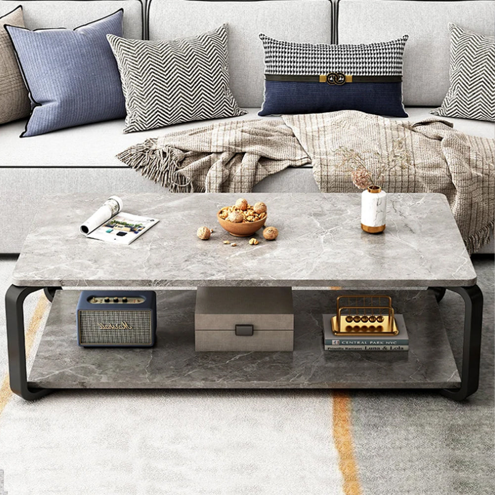 Tavolino Basso da Caffè 2 Ripiani Design Luxury Effetto Marmo Nero e Grigio Chiaro
