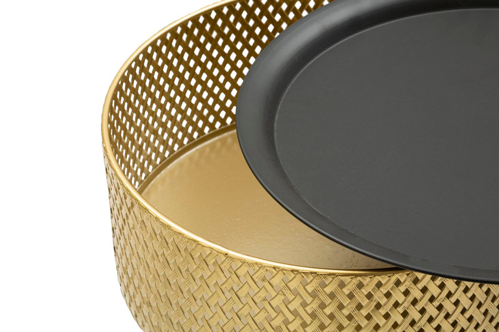 Table basse ronde en métal doré avec plateau noir. La partie supérieure est finement décorée de tissages pour donner une touche d'élégance. Le dessus est amovible, à l'intérieur il y a un récipient pratique.