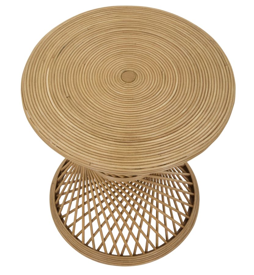 Table basse ronde en rotin, le tissage particulier de la structure donne une touche hypnotique d'élégance à n'importe quel environnement.