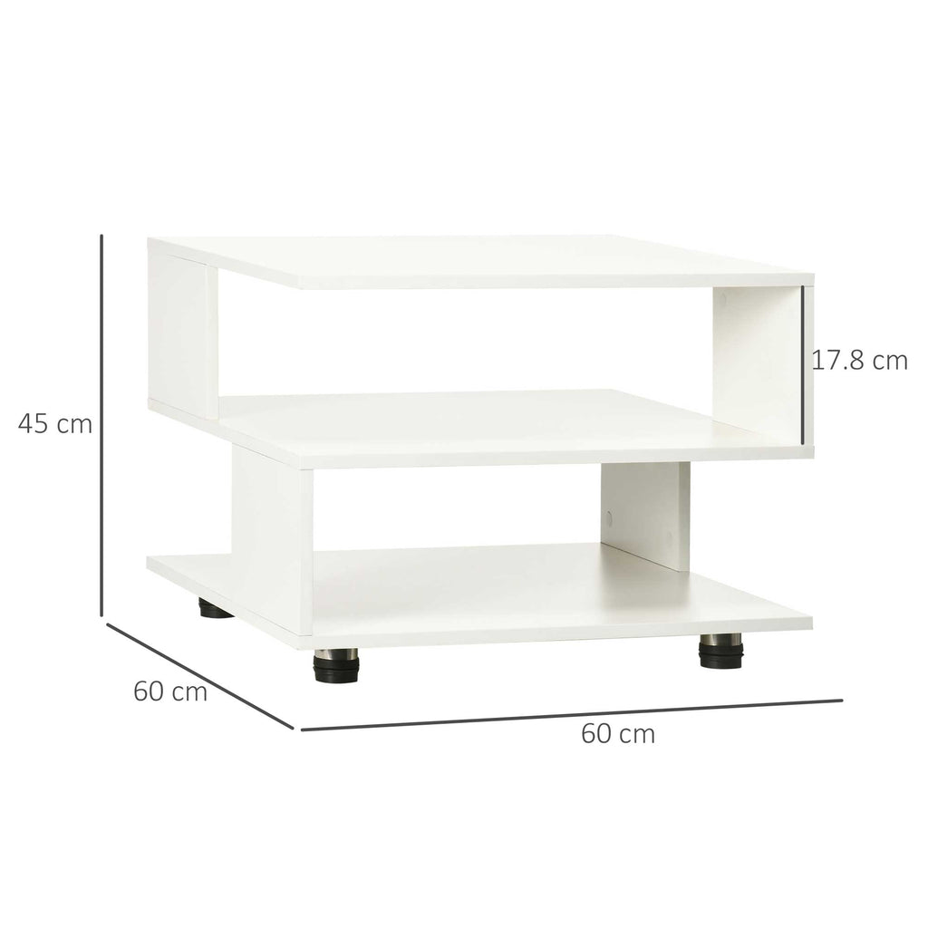 Table basse asymétrique 60x60x45 cm avec étagères et pieds réglables en bois blanc
