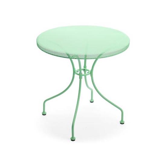Table à 4 pieds en fer et plateau en fer ajouré poudré vert d'eau, Table d. cm 70 X h71 jambière d. 16 mm x 1,1Table Basse de Jardin en Fer et Plateau Perforé Taddei Netty Vert