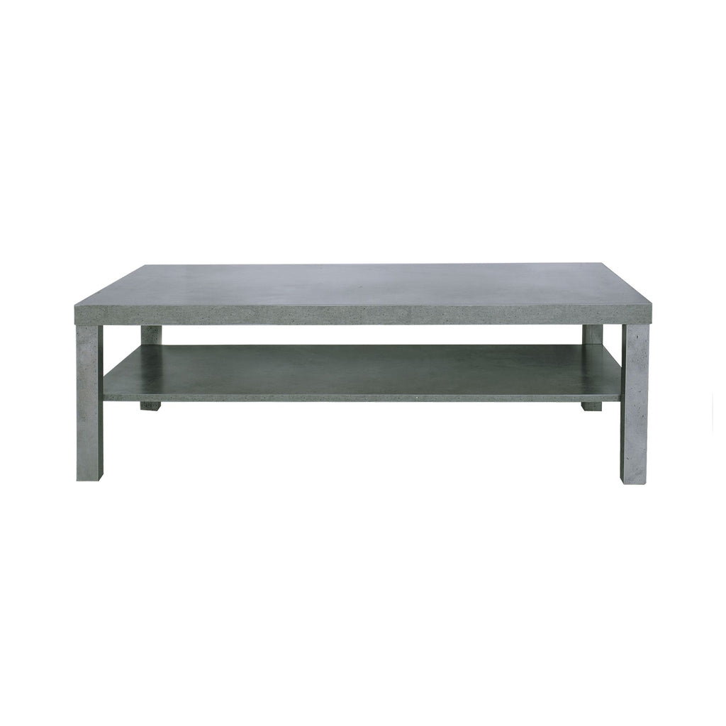 Table basse rectangulaire avec structure en bois et deux étagères finition ciment.