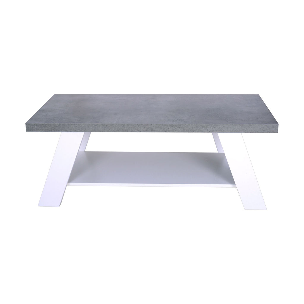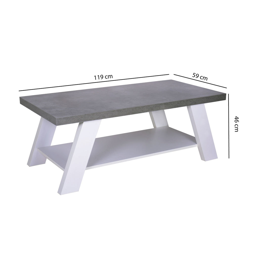 Table basse rectangulaire avec structure en bois avec deux étagères supérieures en ciment et pieds finition blanc.