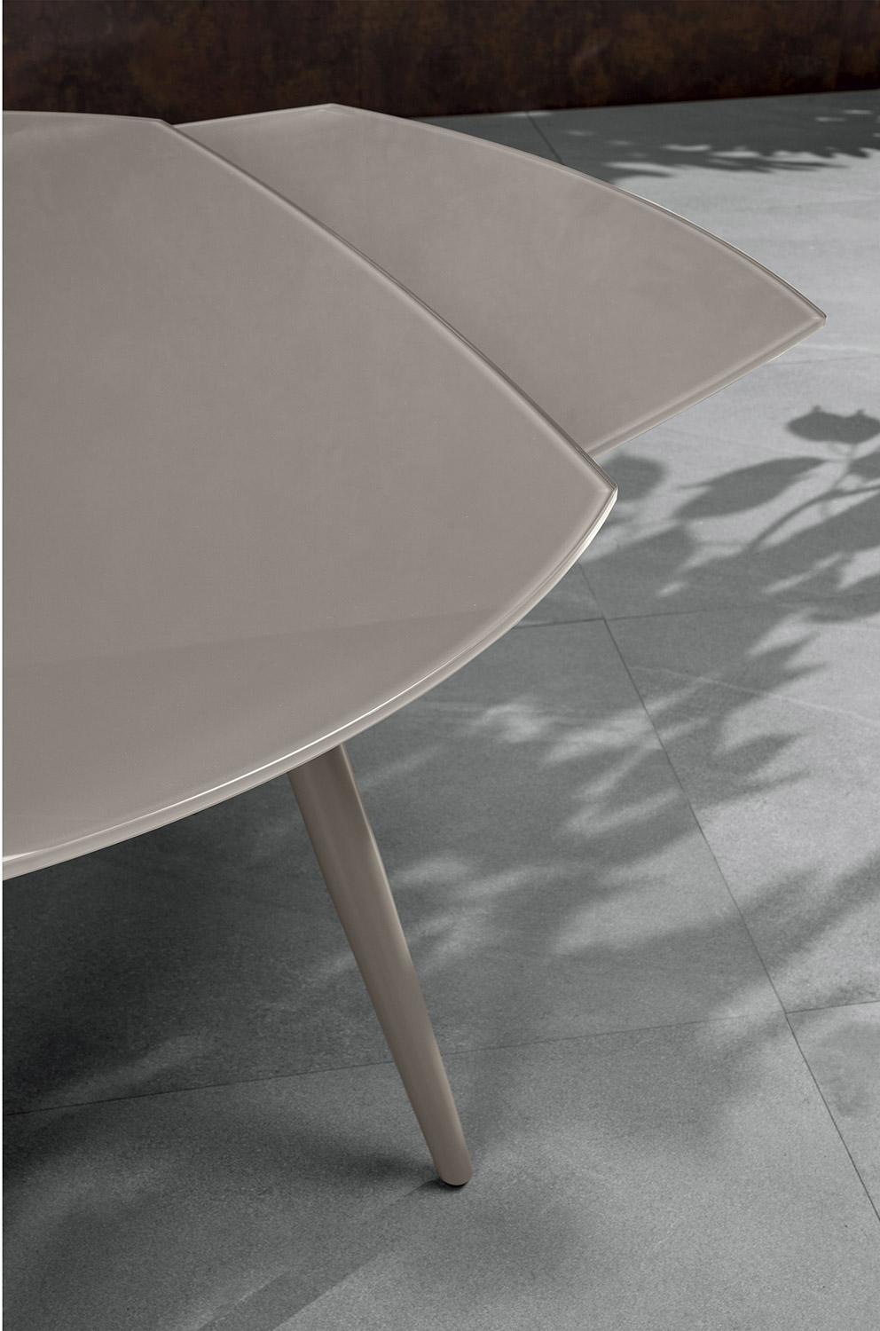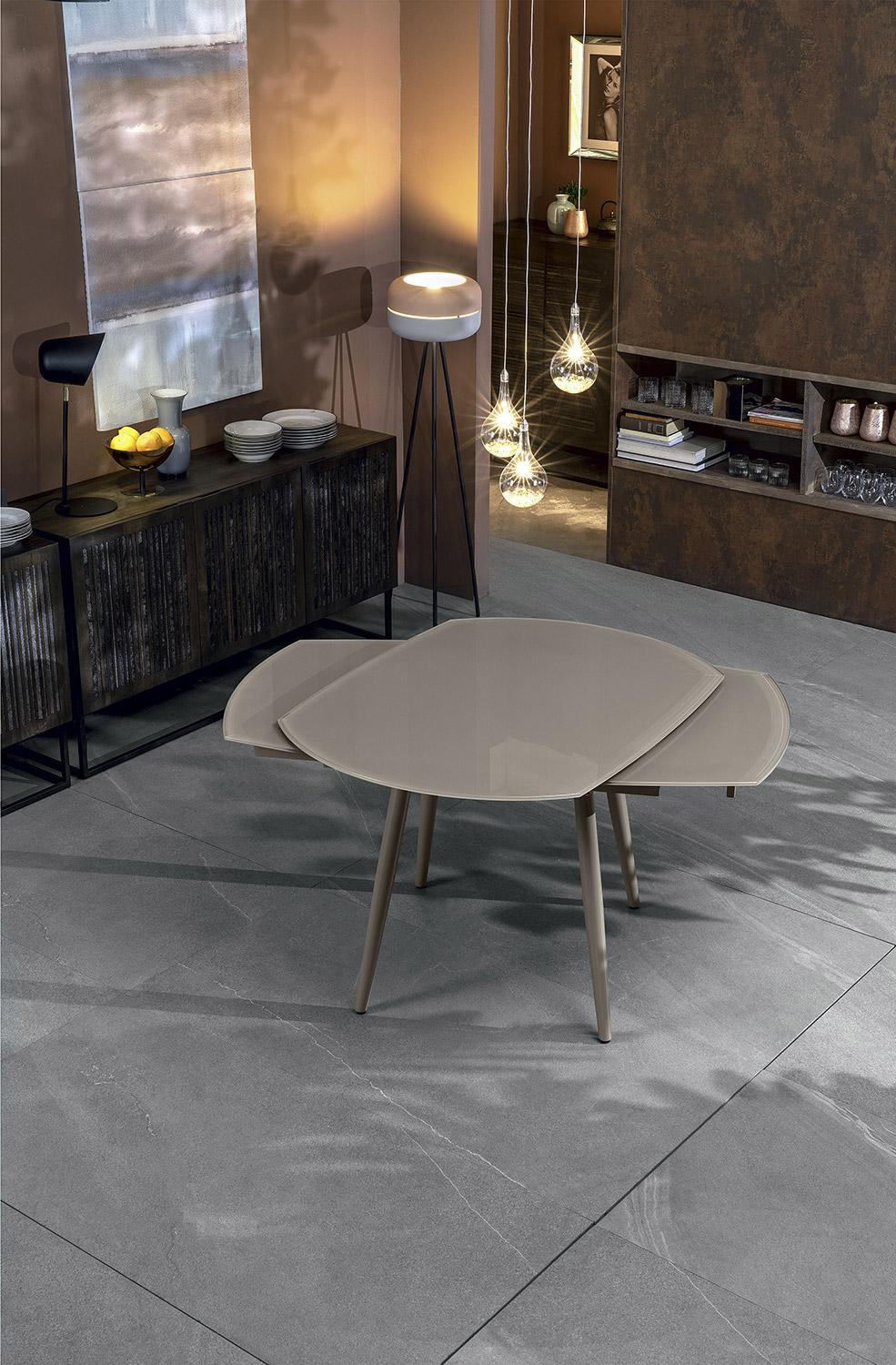 Table extensible 120/180x90x76 cm en métal avec plateau en verre gris tourterelle