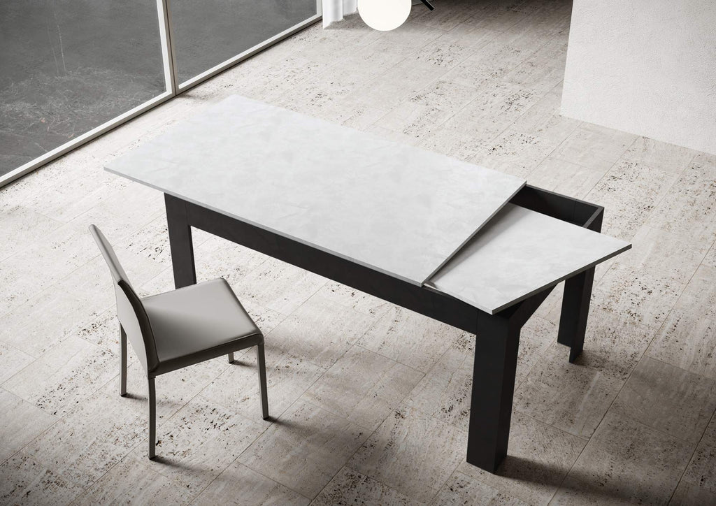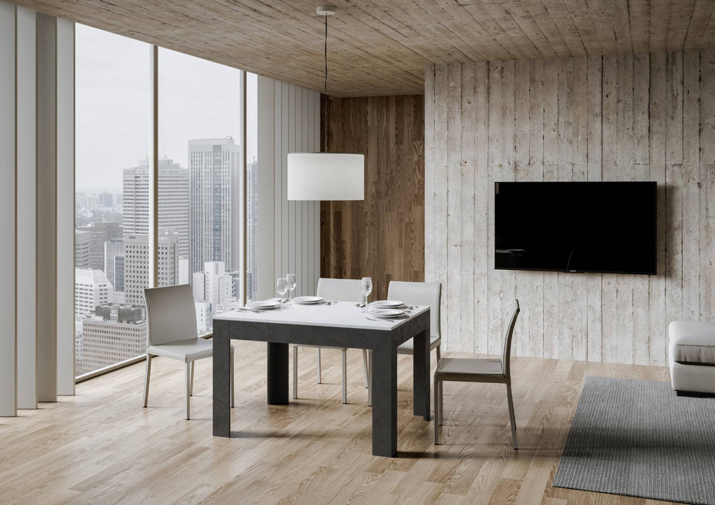 Tavolo Bibi Mix 120 allungabile a 180, una nuova versione del tavolo allungabile Bibi disponibile con piano e allunga in finitura diverso rispetto alle gambe nella combinazione di colori. Una soluzione di design e di contrasto, capace di riportare un piacevole effetto visivo a qualunque ambiente, arricchendolo con personalità e identità. Il tavolo è dotato di una allunga da 60 cm che gli permette di estendersi fino a 180 cm, aumentando così sensibilmente la propria capienza. Il meccanismo di apertura del tavolo è a scorrimento, per cui semplicemente facendo scorrere il piano sulle guide del telaio, si creerà lo spazio necessario all'inserimento dell'allunga laterale. Quando non utilizzata, l'allunga può essere riposta al di sotto del piano. Gambe, piano e allunga sono realizzati in microparticelle di legno, disponibili in diverse combinazioni di colori: Made in Italy con materiali 100% italiani.