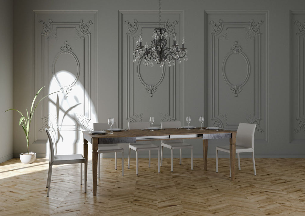 Tavolo Impero Iron 120 Allungabile. Il Tavolo Impero Iron rivoluziona il concetto di Tavolo Allungabile. Può essere allungati progressivamente scegliendo di aggiungere una o due allunghe raggiungendo la larghezza desiderata. Tutte le allunghe sono da 52 cm.Il Tavolo Impero Iron ha le allunghe alloggiate sotto il piano, pronte all'utilizzo. Piano in microparticelle di legno e Telaio sottopiano in metallo verniciato. Realizzata interamente in Italia mediante l'utilizzo di materiali 100% italiani. Composta essenzialmente da quattro parti: struttura portante in metallo verniciato, telaio con porta allunghe, le allunghe sono alloggiate sotto il piano principale, piano superiore in microparticelle di legno apribile su guida in metallo e gambe in legno massello.