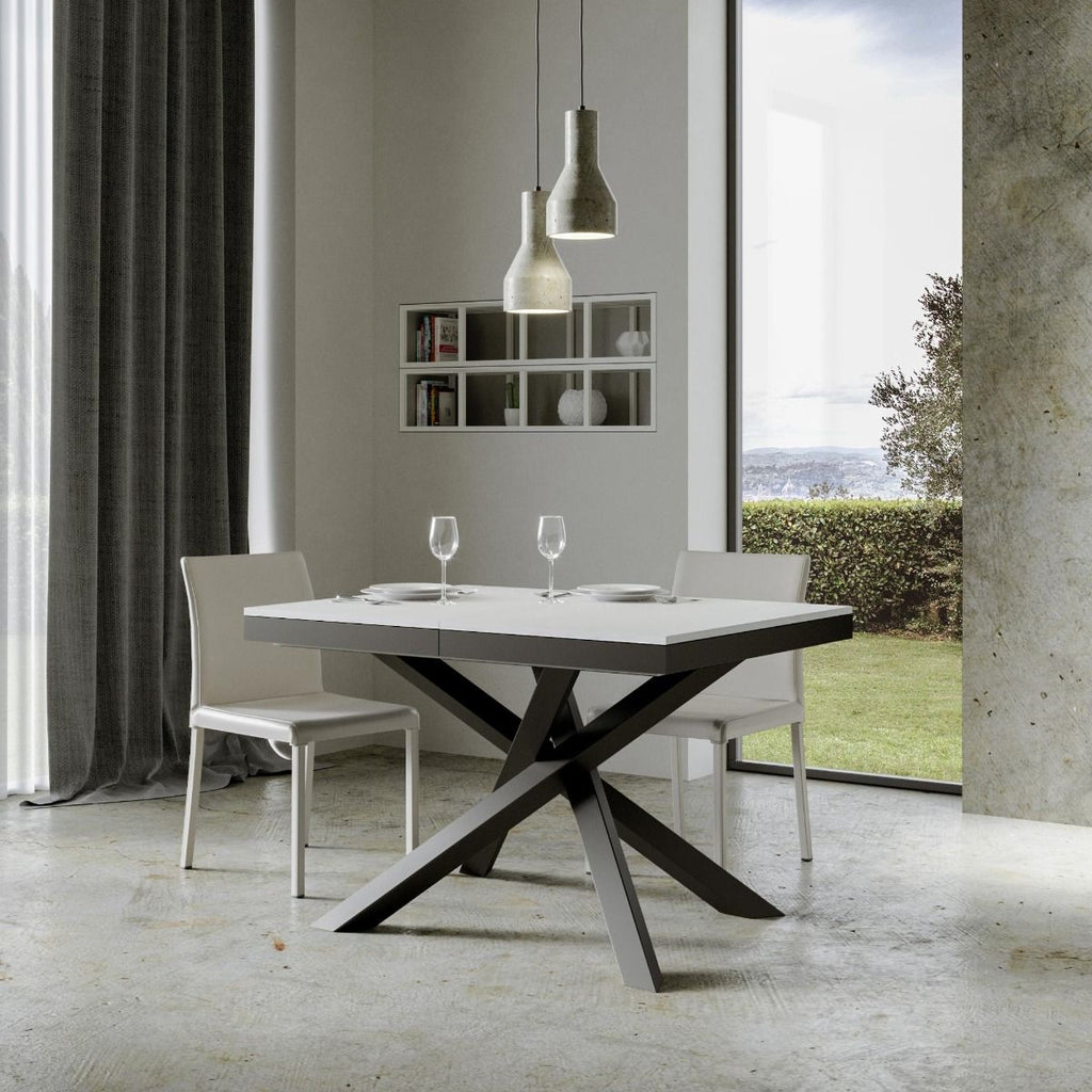 Tavolo Volantis Evolution 120 Allungabile fino a 380. Il Tavolo Volantis Evolution rivoluziona il concetto di Tavolo Allungabile. Viene proposto nella dimensione 120x90. Può essere Allungato progressivamente scegliendo di aggiungere da una a cinque allunghe raggiungendo la larghezza desiderata. Tutte le allunghe sono da 52 cm. Il Tavolo Volantis Evolution ha due allunghe alloggiate sotto il piano, pronte all'utilizzo, le altre tre sono da riporre in altro luogo quando non utilizzate. Piani in microparticelle di legno disponibile in vari colori e telaio sottopiano e gambe in ferro verniciato. Realizzata interamente in Italia mediante l'utilizzo di materiali 100% italiani. Due allunghe sono alloggiate sotto il piano principale. piano superiore in microparticelle di legno apribile su guida in metallo. Gambe in ferro.