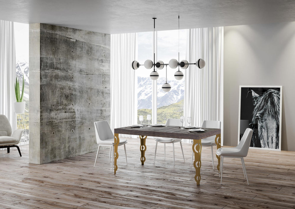 Il Tavolo Karamay 130 Allungabile fino a 390 cm è una linea dallo stile stravagante e raffinato, grazie alle particolari decorazioni delle gambe. Le gambe in metallo verniciato è in grado di garantire solidità alla struttura, anche quando completamente esteso. Si adatta ad ogni esigenza di spazio, grazie al particolare sistema di allunghe che gli permette di estendersi fino a 390 cm. Le allunghe presentano la stessa finitura del piano. Due allunghe sono alloggiate sotto al piano pronte all'utilizzo, mentre le altre tre rimangono senza alloggio. Made in Italy con materiali 100% italiani.