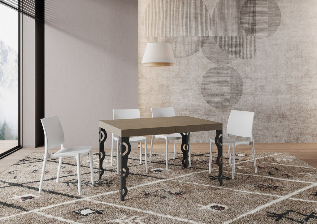 Tavolo allungabile Karamay da 140 cm, dal design moderno dallo stile ricercato e stravagante, si adatta a qualsiasi stile di arredamento e si rivela la scelta ideale sia come tavolo da pranzo che come elemento d'arredo per il soggiorno, dove poter accogliere i propri ospiti con stile. Il tavolo allungabile Karamay è in grado di estendersi progressivamente fino a 244 cm capace di ospitare 12 persone. Realizzato con pannelli in nobilitato, gambe in ferro, piano con lavorazione a Folding. Il sistema di estensione con guide telescopiche in alluminio rende il tavolo stabile e robusto anche se totalmente allungato, senza bisogno di ulteriori sostegni. Le allunghe sono immediatamente pronte all'utilizzo in quanto alloggiate sotto il piano principale.
