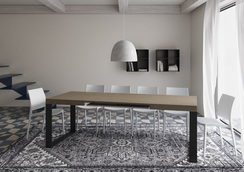Tavolo allungabile Tecno da 140 cm, dal design lineare, semplice ed essenziale, si adatta a qualsiasi stile di arredamento e si rivela la scelta ideale sia come tavolo da pranzo che come elemento d'arredo per il soggiorno, dove poter accogliere i propri ospiti con stile. Il tavolo allungabile Tecno è in grado di estendersi progressivamente fino a 400 cm capace di ospitare 18 persone. Realizzato con pannelli in nobilitato, gambe in ferro, piano con lavorazione a Folding. Il sistema di estensione con guide telescopiche in alluminio rende il tavolo stabile e robusto anche se totalmente allungato, senza bisogno di ulteriori sostegni. Due allunghe sono alloggiate sotto il piano pronte all'utilizzo mentre le rimanenti tre vanno riposte altrove.