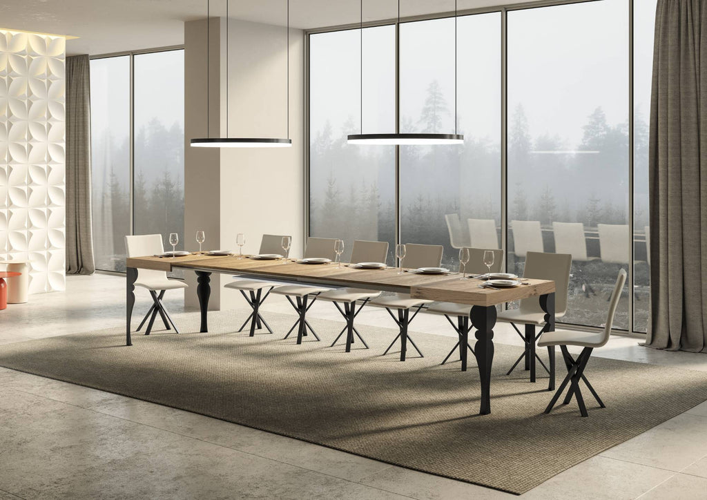 Il Tavolo Paxon 160 Allungabile fino a 420 cm è una linea dallo stile stravagante e raffinato, grazie alle particolari decorazioni delle gambe. Le gambe in ferro verniciato è in grado di garantire solidità alla struttura, anche quando completamente esteso. Si adatta ad ogni esigenza di spazio, grazie al particolare sistema di allunghe che gli permette di estendersi fino a 420 cm. Le allunghe presentano la stessa finitura del piano. Due allunghe sono alloggiate sotto al piano pronte all'utilizzo, mentre le altre tre rimangono senza alloggio. Made in Italy con materiali 100% italiani.