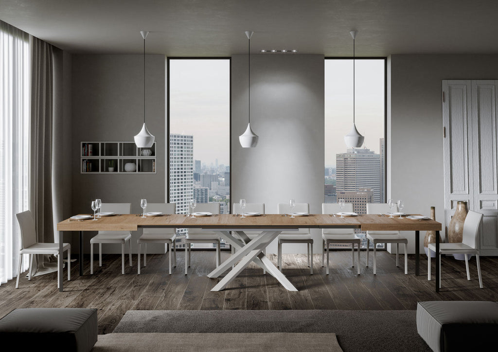 Tavolo allungabile Volantis da 160 cm, dal design moderno dallo stile sofisticato, si adatta a qualsiasi stile di arredamento e si rivela la scelta ideale sia come tavolo da pranzo che come elemento d'arredo per il soggiorno, dove poter accogliere i propri ospiti con stile. Il tavolo allungabile Volantis è in grado di estendersi progressivamente fino a 420 cm capace di ospitare 18 persone. Realizzato con pannelli in nobilitato, gambe in ferro, piano con lavorazione a Folding. Il sistema di estensione con guide telescopiche in alluminio e i sostegni laterali in dotazione rendono il tavolo stabile e robusto anche se totalmente allungato. Due allunghe sono alloggiate sotto il piano pronte all'utilizzo mentre le rimanenti tre vanno riposte altrove.