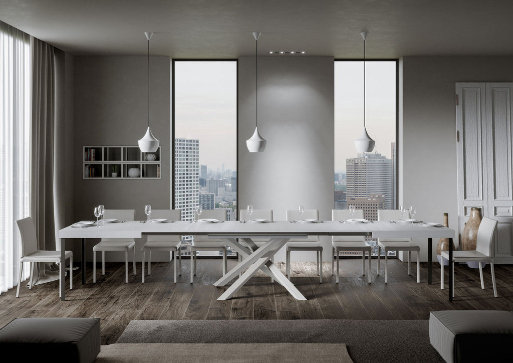 Tavolo allungabile Volantis da 180 cm, dal design moderno dallo stile sofisticato, si adatta a qualsiasi stile di arredamento e si rivela la scelta ideale sia come tavolo da pranzo che come elemento d'arredo per il soggiorno, dove poter accogliere i propri ospiti con stile. Il tavolo allungabile Volantis è in grado di estendersi progressivamente fino a 440 cm capace di ospitare 18 persone. Realizzato con pannelli in nobilitato, gambe in ferro, piano con lavorazione a Folding. Il sistema di estensione con guide telescopiche in alluminio e i sostegni laterali in dotazione rendono il tavolo stabile e robusto anche se totalmente allungato. Due allunghe sono alloggiate sotto il piano pronte all'utilizzo mentre le rimanenti tre vanno riposte altrove.