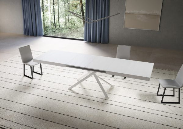 Tavolo allungabile Niket da 200 cm, dal design moderno dallo stile sofisticato, si adatta a qualsiasi stile di arredamento e si rivela la scelta ideale sia come tavolo da pranzo che come elemento d'arredo per il soggiorno, dove poter accogliere i propri ospiti con stile. Il tavolo allungabile Niket è in grado di estendersi progressivamente fino a 304 cm capace di ospitare 12 persone. Realizzato con pannelli in nobilitato, gambe in ferro, piano con lavorazione a Folding. Il sistema di estensione con guide telescopiche in alluminio rende il tavolo stabile e robusto anche se totalmente allungato, senza bisogno di ulteriori sostegni. Le allunghe sono immediatamente pronte all'utilizzo in quanto alloggiate sotto il piano principale.