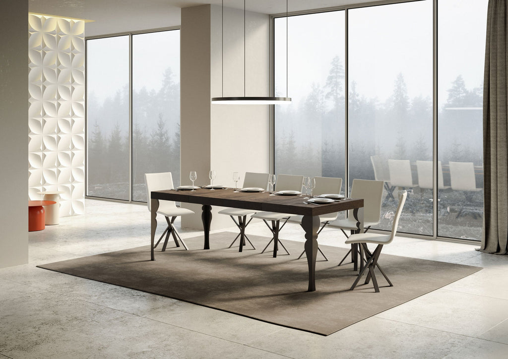 Tavolo allungabile Paxon Premium da 200 cm, dal design moderno dallo stile ricercato e stravagante, si adatta a qualsiasi stile di arredamento e si rivela la scelta ideale sia come tavolo da pranzo che come elemento d'arredo per il soggiorno, dove poter accogliere i propri ospiti con stile. Il tavolo allungabile Paxon Premium è in grado di estendersi progressivamente fino a 460 cm capace di ospitare 18 persone. Realizzato con pannelli in nobilitato, gambe in ferro, piano e allunghe con lavorazione a Folding. Il sistema di estensione con guide telescopiche in alluminio rende il tavolo stabile e robusto anche se totalmente allungato, senza bisogno di ulteriori sostegni. Quando non utilizzate, le allunghe non trovano collocamento all’interno della struttura del tavolo e vanno quindi riposte altrove.