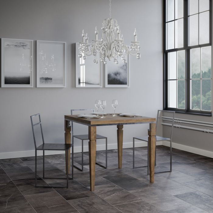 Tavolo Impero Libra cm.90. Tavolo quadrato 90x90 estremamente pratico e compatto nelle sue dimensioni originali. Il piano quadrato da 90 centimetri è composto da due piani. Facendolo scorrere sulle apposite guide, aprendolo a libro, in pochi secondi può essere trasformato in un Tavolo rettangolare da 90x180 raddoppiando l'area di utilizzo. Piano in microparticelle di legno. Telaio in acciaio verniciato. Realizzata interamente in Italia mediante l'utilizzo di materiali 100% italiani. Composta essenzialmente da tre parti: struttura portante in metallo verniciato, piano superiore in microparticelle di legno apribile a libro su guida in metallo e gambe in legno massello.