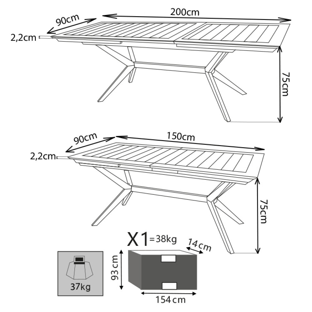 Table Bali 150/200x90x75 h cm en bois d'acacia marron