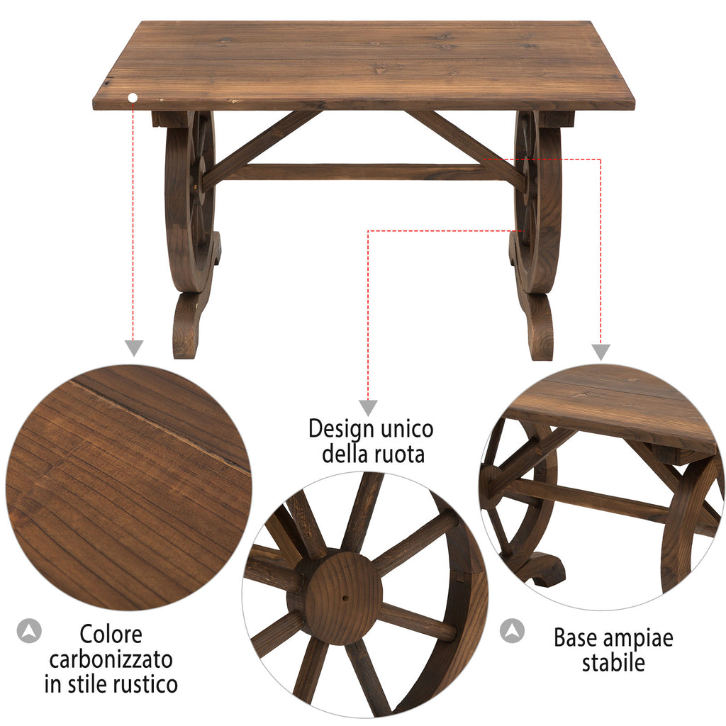 vous propose cette table de jardin originale en bois de sapin au style champêtre pour égayer vos pièces. Résiste aux intempéries, à la déformation et à la fissuration. Vous pouvez l'utiliser comme table basse ou pour un déjeuner en plein air entre amis. Les pieds en forme de roue et le bois effet carbonisé apportent une touche d'originalité à votre salon de jardin. Facile à assembler et livré avec des accessoires de montage.