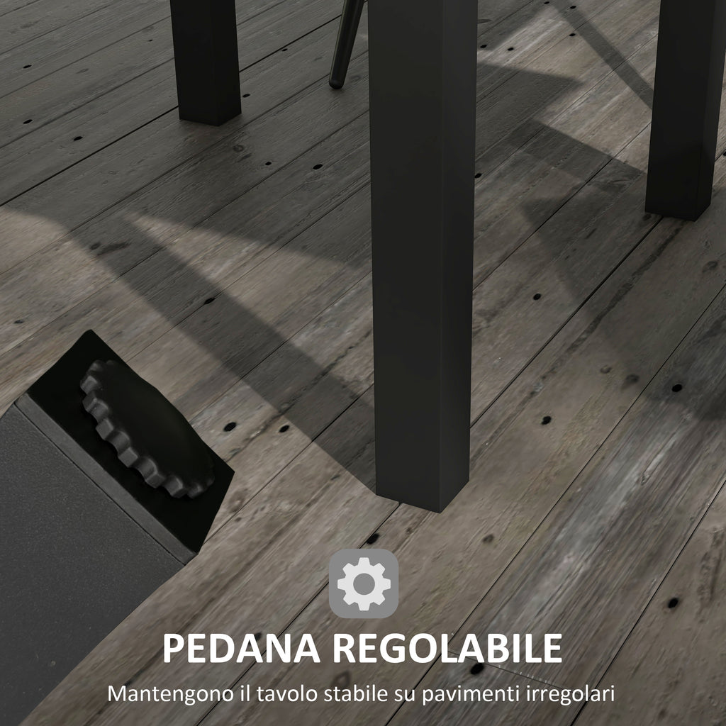 Il tavolo da giardino rappresenta una superficie versatile che si adatta ai tuoi pranzi all'aperto. Può accogliere 4 persone, ma può essere facilmente ampliato fino a 6 quando in caso di necessità. Realizzato in alluminio verniciato a polvere, la struttura è impermeabile, leggera e facile da spostare. Grazie al classico design a doghe, il drenaggio della pioggia è semplificato, mentre le pedane regolabili si adattano facilmente a qualsiasi tipo di pavimento.