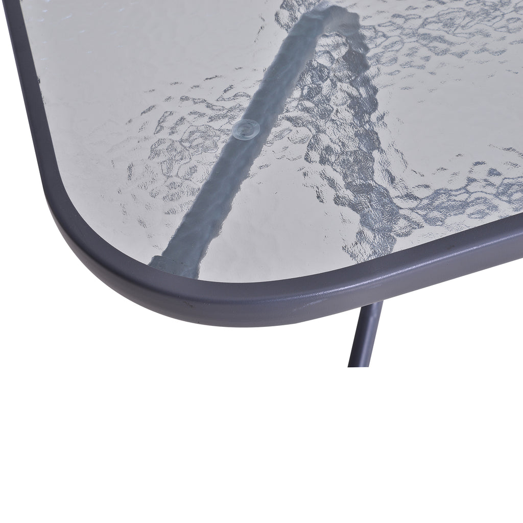 Donnez de l'élégance, du style et du goût à votre environnement avec cette table d'extérieur. Construit en métal et en verre trempé, il est robuste et résistant, idéal par tous les temps. Parfait aussi bien pour un dîner romantique que pour une collation rapide, il comporte un trou central où vous pourrez insérer votre parapluie .