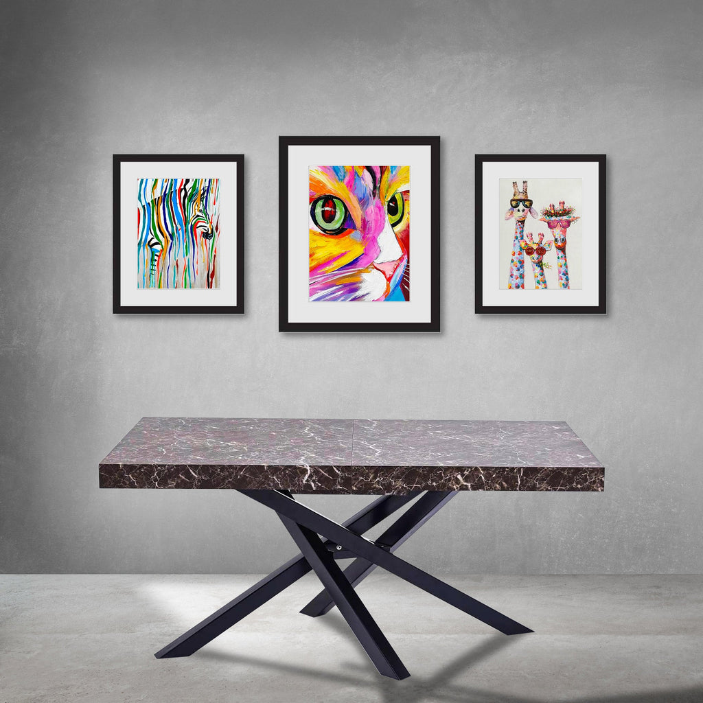 C'est une table pratique et moderne, parfaite pour décorer un salon ou une cuisine au style jeune, industriel et original, son design captivant vous séduira ! Il se caractérise par un plateau en mélamine et des pieds croisés en fer thermolaqué qui garantissent une grande stabilité et confort. La table est conçue pour accueillir de 8 à 10-12 personnes dans sa version allongée. Lors de l'ouverture de la table, il y a 2 extensions à utiliser. Le produit est démonté en 2 colis, avec tout le nécessaire pour le montage déjà à l'intérieur de l'emballage.