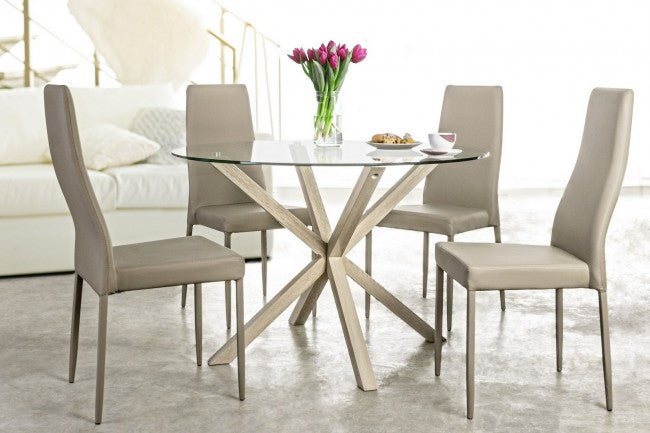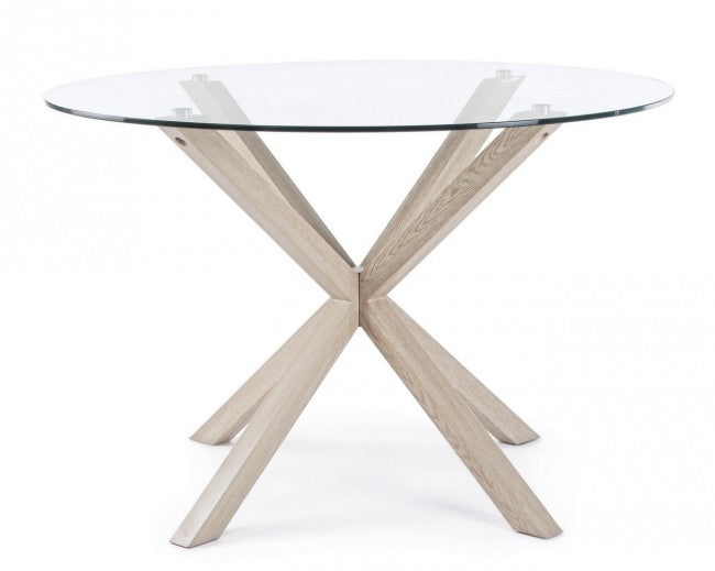 Table ronde avec plateau en verre et pieds en bois naturel D114 ronde en verre