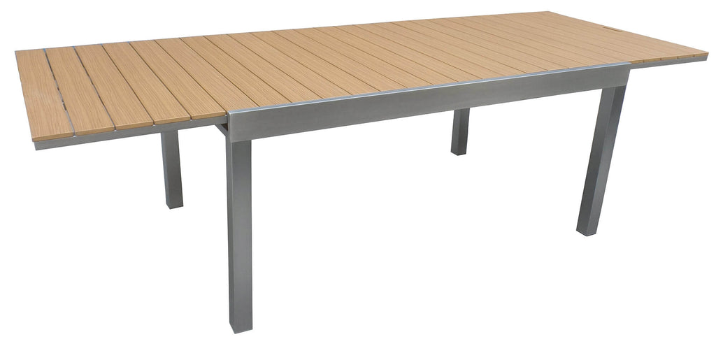 - Matériau : Structure en aluminium satiné et plateau en bois de résine couleur teck