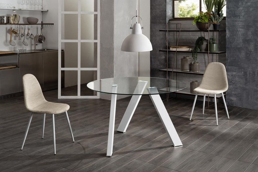 Table ronde design, parfaite pour n'importe quel espace et grâce au plateau en verre elle donne lumière et légèreté à la pièce.