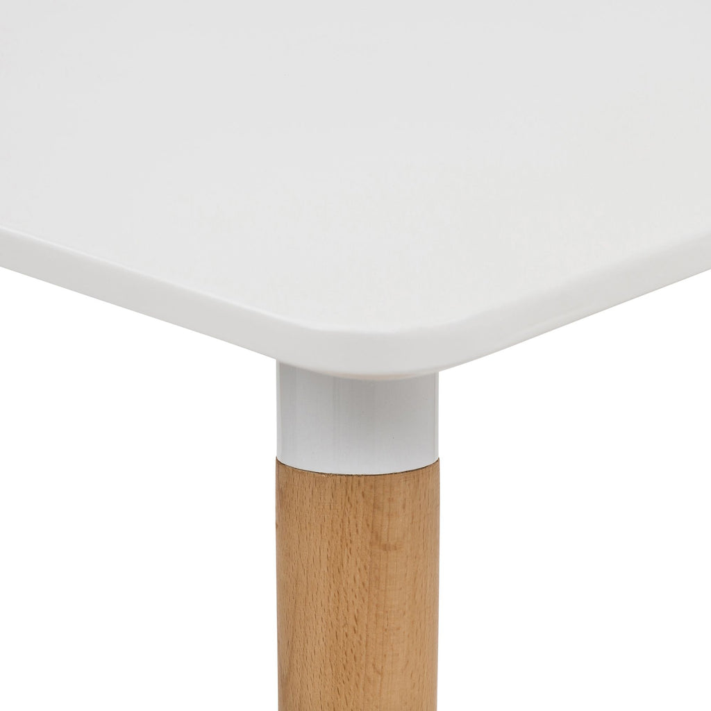 Table avec pieds en bois de hêtre et pieds en métal. Plateau en MDF laqué blanc soutenu par un piètement en métal laqué blanc.