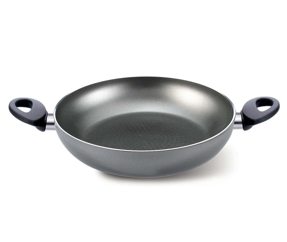 Poêle arrondie à 2 anses en bakélite fabriquée avec le revêtement exclusif ECOTITAN renforcé de minéraux durs, ultra résistant aux rayures et à l'abrasion. garantit des propriétés antiadhésives maximales sans ajout d'huiles et de graisses. Double fond en acier inoxydable estampé, indéformable, économe en énergie, adapté à tous les feux, y compris INDUCTION (brevet Silex Italia)