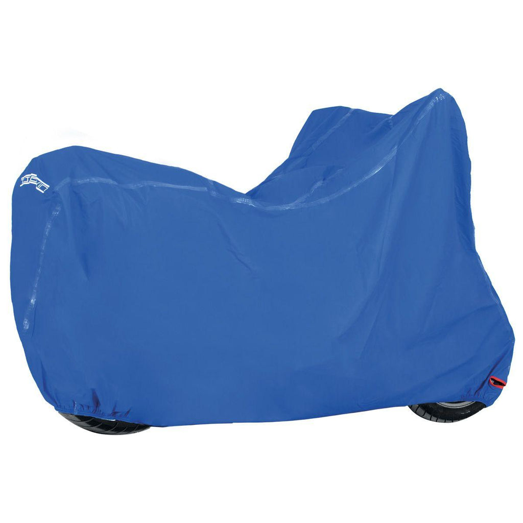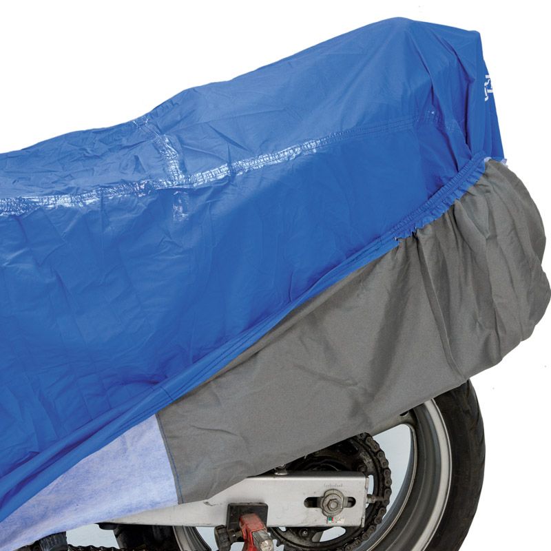 Housse moto en tissu imperméable avec doublure anti-rayures, coutures étanches et anneaux antivol. Idéal pour réparer les motos et les scooters de la pluie et de la poussière. Très faible encombrement : il se range confortablement dans le sac avec poignée incluse.