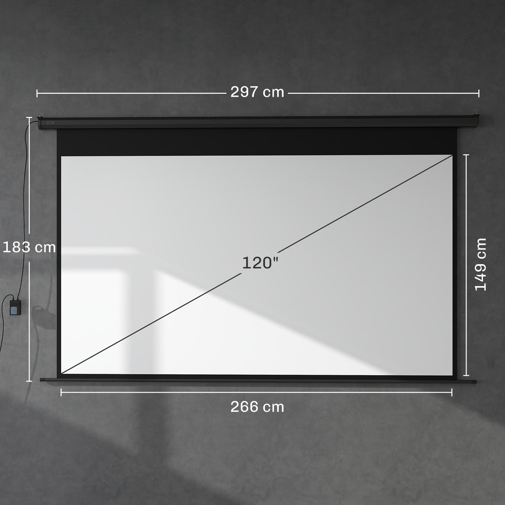 • DIMENSIONI: Dimensioni complessive: 266L x 149A cm. Rapporto d'aspetto: 16:9. Diagonale: 120 pollici. Potenza: 25 W. Montaggio richiesto