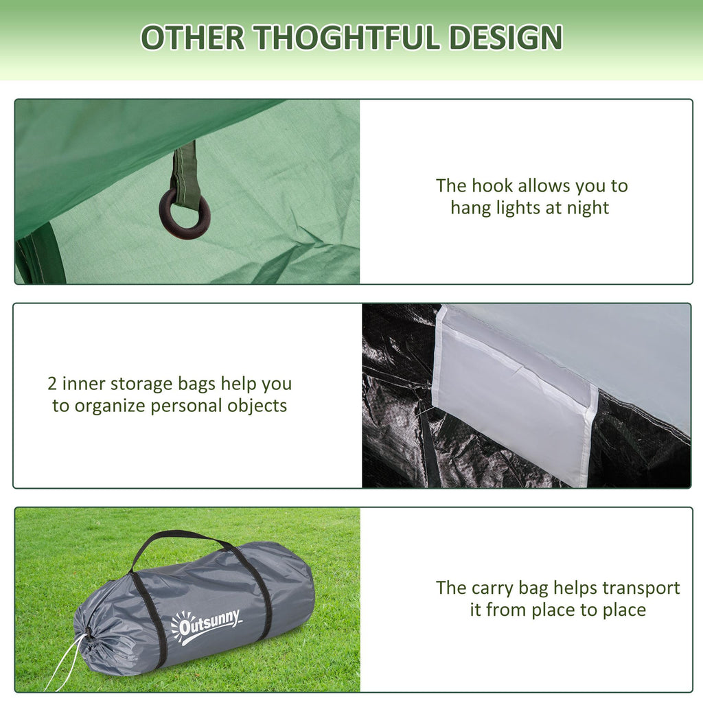 - CONCEPTION PRATIQUE : La tente de camping est équipée de quatre portes zippées pour un accès facile. Le crochet vous permet d'accrocher des veilleuses, tandis que 2 sacs internes vous aident à ranger des téléphones portables ou d'autres petits objets. Le sac de transport permet de transporter cette tente d'un endroit à un autre.
