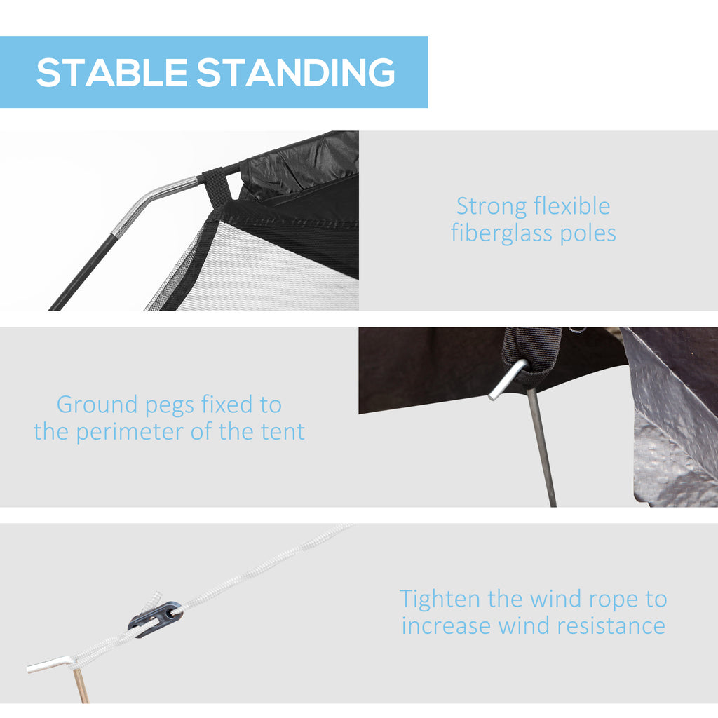 Accomodati in compagnia in modo confortevole durante i campeggi, i picnic e altre occasioni con questa tenda a rete di . Grazie al tessuto in taffetà con rivestimento in PU argentato e ai pali flessibili in fibra di vetro, resterai al riparo dal sole, dai raggi UV e dai fastidiosi insetti. I picchetti in metallo e le solide corde antivento aiutano a mantenere la tenda stabile e sicura sul terreno. Inizia a organizzare le gite fuoriporta con questa tenda da campeggio!