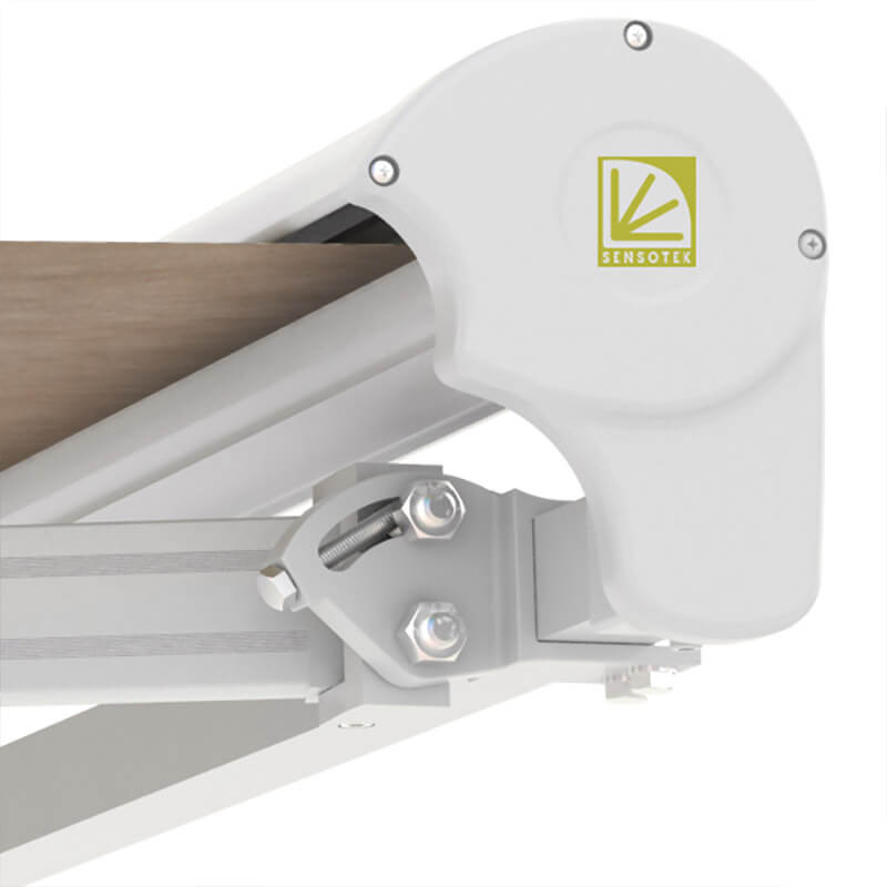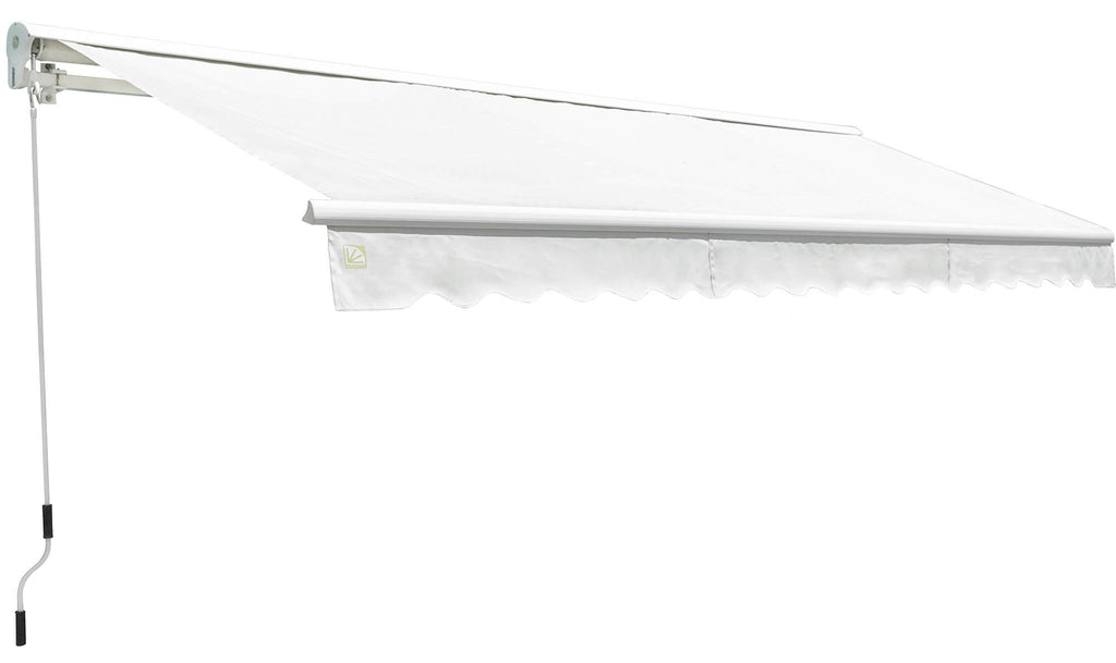 Store extérieur ligne Luxury avec adaptateur d'angle et tissu polyester écru 280 g, protection UV80, traitement anti-pluie et structure en aluminium blanc.