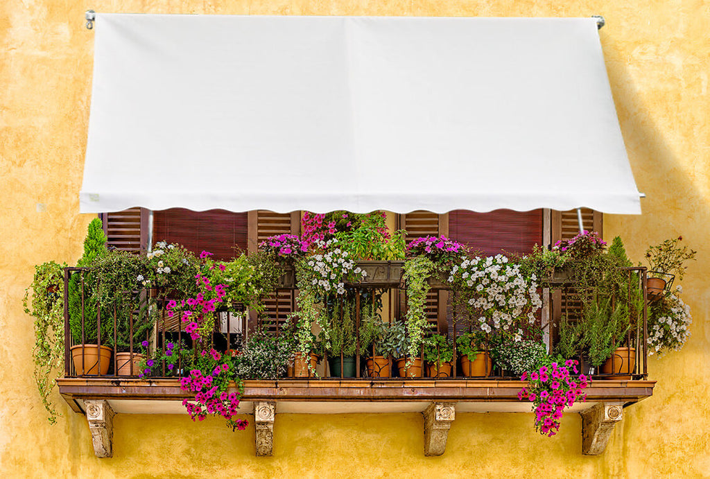 Store de balcon avec tissu polyester écru 280 g, protection UV80 et structure en aluminium blanc.