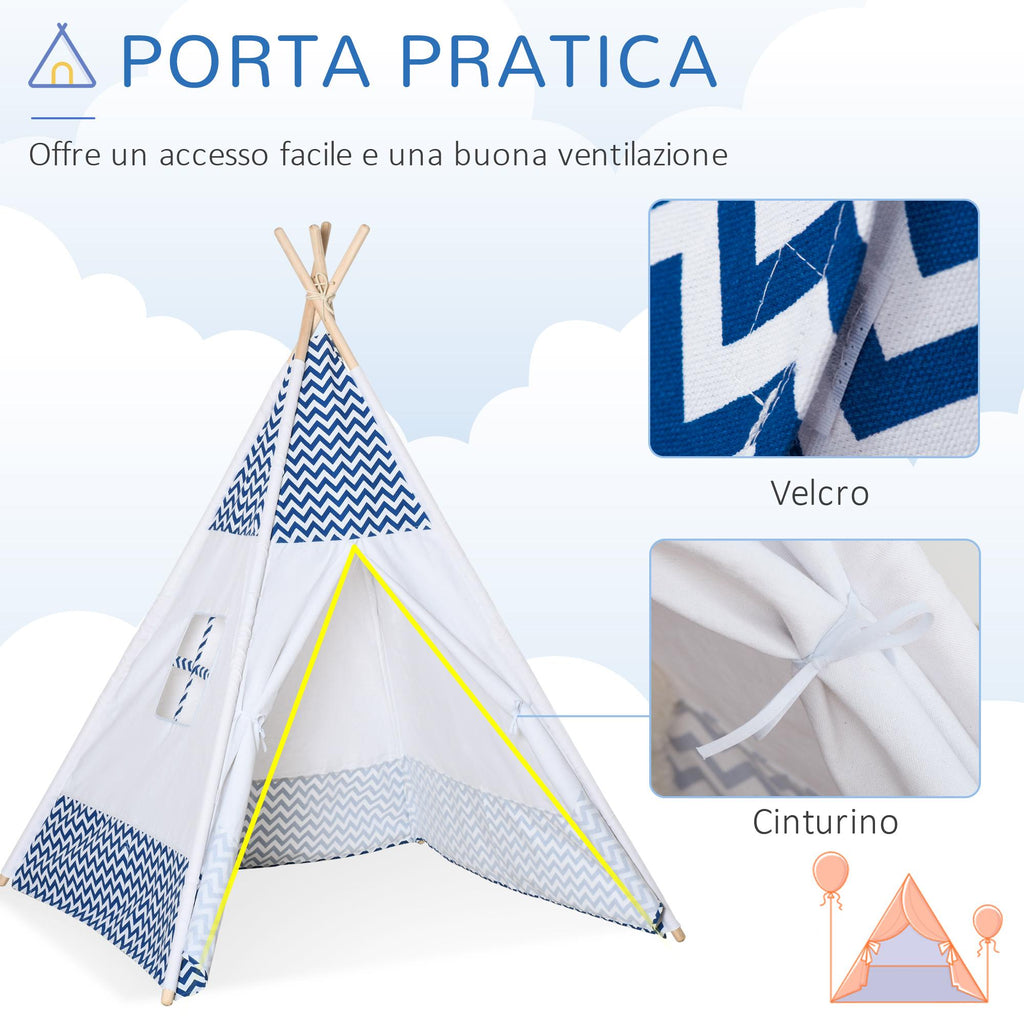 Tente indienne pour enfants 120x120x155 cm en tissu et bois blanc et bleu