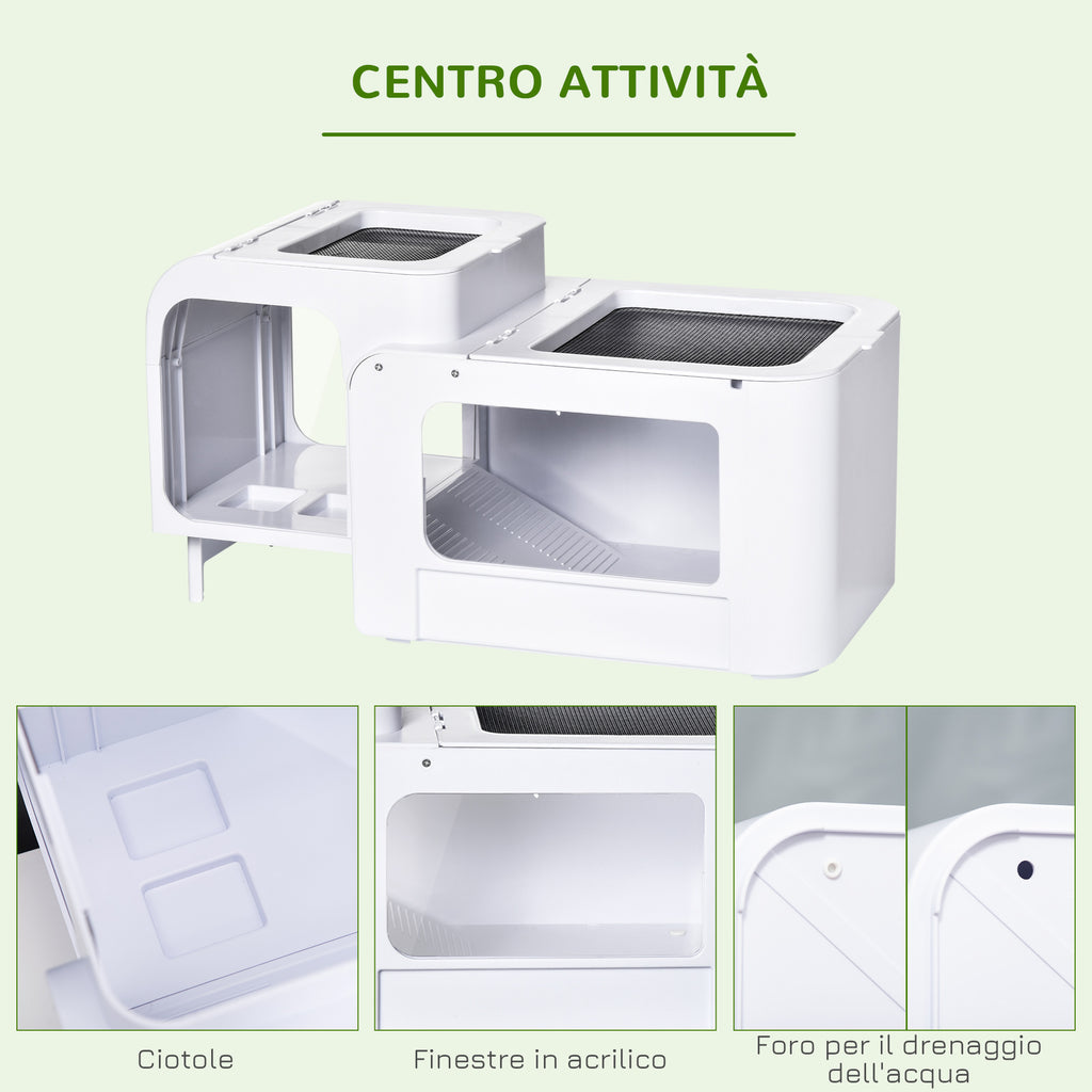 - 2 PLATEFORMES : Ce terrarium pour tortues est composé de deux plates-formes aux fonctions différentes. Celui de gauche reproduit le milieu terrestre et est équipé de bols alimentaires. Celui de droite reproduit le milieu marin et est équipé d'un trou pour l'évacuation de l'eau.