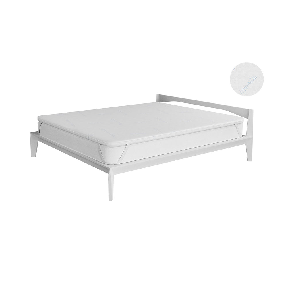 Topper Memory sfoderabile, con fodera contenente fibra Bioceramica. Articolo provvisto di 4 robusti elastici per ancoraggio al materasso. Imbottitura in memory studiata per garantire il massimo del comfort. Altezza topper: 5cm. Tessuto utilizzato:linea Bioceramica.Le fibre bioceramiche conferiscono al tessuto le seguenti caratteristiche: -Elevata coibenza termica, ovvero le fibre isolano dal freddo. -Emissione raggi Fir, ovvero grazie all' azione della bioceramica, il calore del corpo viene assorbito dal filato per poi essere resituito sotto forma di raggi FIR in grado di penetrare gli strati sottocutanei e di stimolare il sistema microcircolatorio, rafforzando il metabolismo. -Resistenza del tessuto, in quanto la sua particolare struttura mantiene l' efficacia costante nel tempo, anche dopo numerosi lavaggi. Il prodotto viene compresso, suggeriamo quindi di aprire il pacco e togliere il prodotto, facendolo espandere per 24-48 ore in modo da godersi un ottimo sonno ristoratore. Articolo Made in Italy.