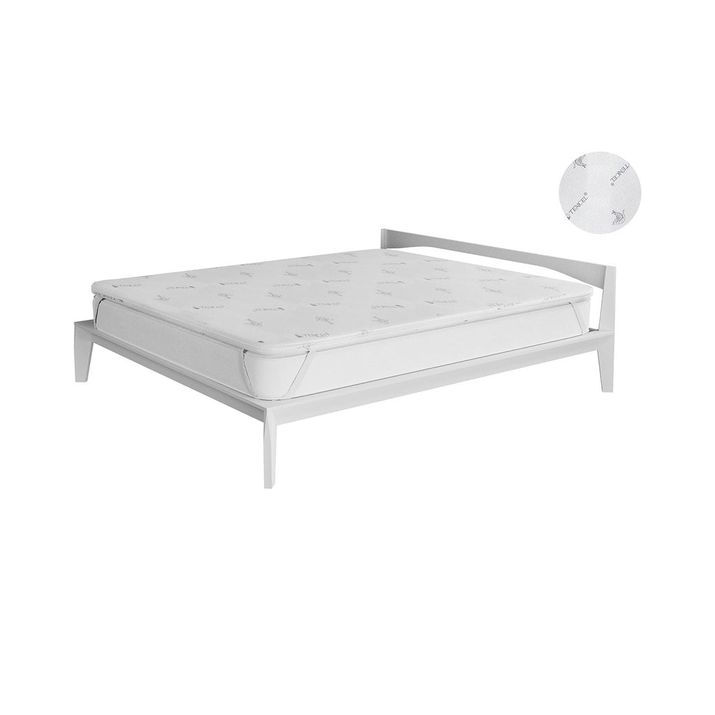 Topper Memory sfoderabile, con fodera contenente fibra Tencel. Articolo provvisto di 4 robusti elastici per ancoraggio al materasso. Imbottitura in memory studiata per garantire il massimo del comfort. Altezza topper: 5cm. Il tessuto utilizzato è costituito dal 5% di fibra di Tencel. Il filato Tencel è un filato ecologico che viene prodotto da alberi di eucalipto, dei quali viene impiegata la polpa di legno e quindi la fibra cellulosa artificiale più compatibile dal punto di vista ambientale. Sono numerosi i vantaggi che derivano dall' impiego di questa fibra, che si fa apprezzare per la sua grande resistenza e per la capacità di assorbire l' umidità oltre che per la sua naturale traspirabilità. La base della fibra è il legno di eucalipto, che ha il pregio di assorbire in modo naturale l' umidità. Caratteristiche: morbido e resistente al tatto, traspirante, leggero e confortevole, la struttura fibrillare contribuisce inoltre a creare un microclima ottimale sulla pelle. I tessuti con fibra tencel sono molto pratici, in quanto sono facili da gestire, lavare, non si stropicciano e si asciugano rapidamente. Questo materiale è inoltre ipoallergenico, in quanto riduce fortemente la formazione di batteri, perchè i batteri nascono nelle condizioni umide, la fibra Tencel assorbe l' umidità, impedisce la formazione di batteri ed anche di acari della polvere, quindi risulta particolarmente indicato per chi soffre di rinite allergica, asma ed eczema, perchè la crescita di batteri è limitata in modo completamente naturale. L'articolo viene compresso, suggeriamo quindi di aprire il pacco e togliere il prodotto, facendolo espandere per 24-48 ore in modo da godersi un ottimo sonno ristoratore. Articolo Made in Italy.
