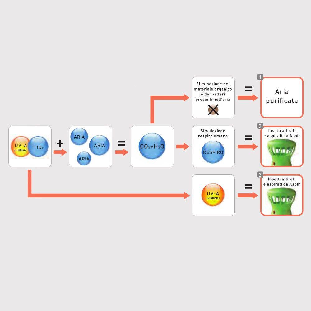 - Il utilise le dioxyde de carbone et l'humidité produite par la réaction photocatalytique, obtenant ainsi la simulation de la respiration humaine qui attire les moustiques et les mouches.