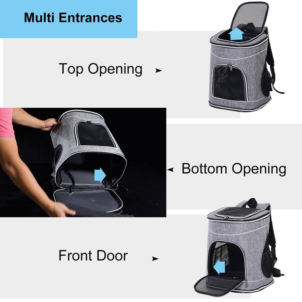 Les 3 entrées du sac à dos sont conçues pour faciliter l'entrée et la sortie de votre chien ou chat, qui pourra s'asseoir sur le rembourrage interne et profiter du voyage.