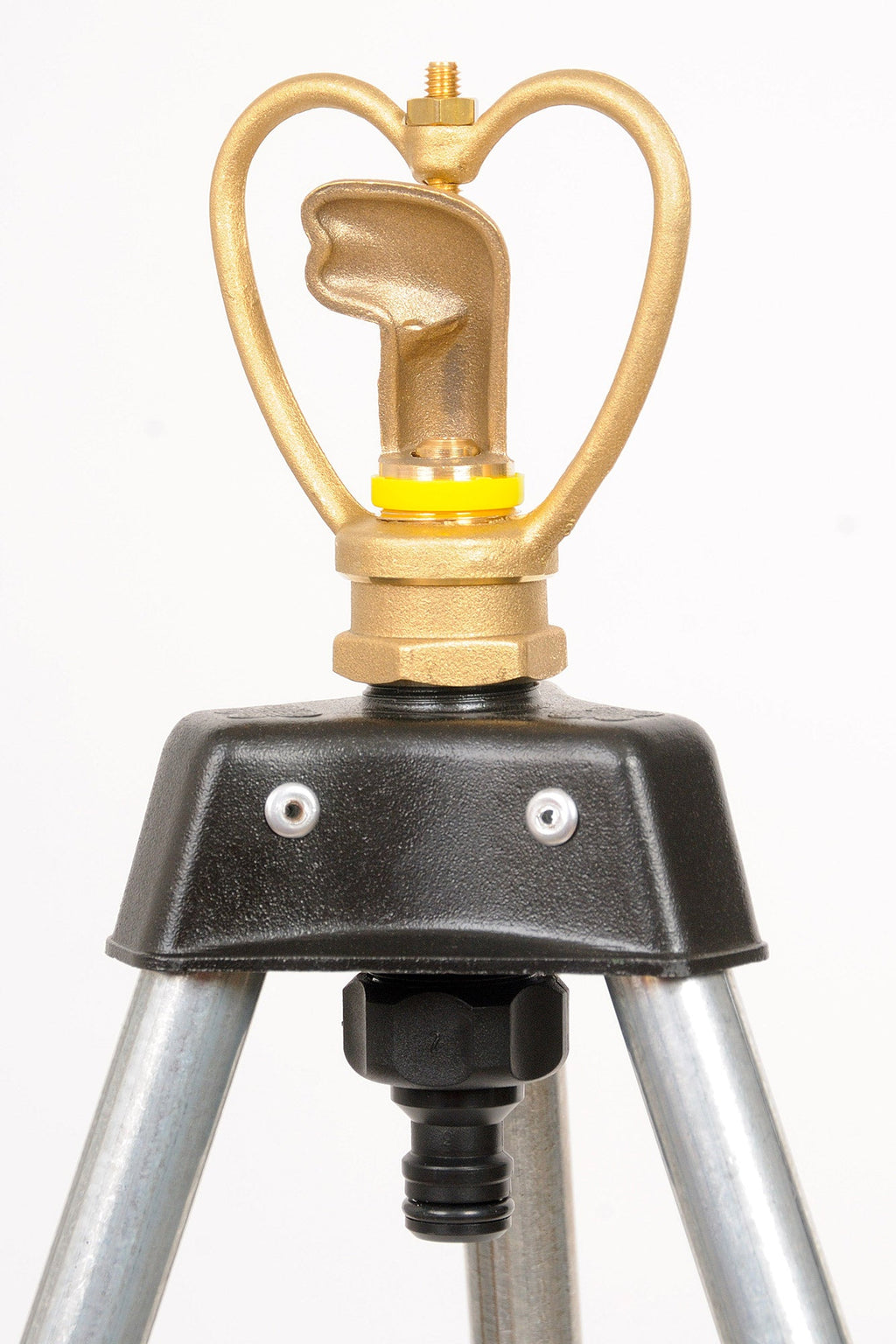 Arroseur à rotation 360° sur trépied, pour une irrigation uniforme des potagers et des espaces verts. L'arroseur est en laiton et est équipé d'un roulement à billes en acier inoxydable pour assurer un fonctionnement parfait dans le temps ; avec une pression de 2 bars (pression généralement fournie par les réseaux d'eau à usage domestique), le périmètre circulaire irrigué a un diamètre d'environ 9 mètres. Le trépied est en acier galvanisé avec des extrémités pointues pour assurer un positionnement stable au sol. Equipé d'un raccord rapide universel pour le raccordement à l'alimentation en eau à l'aide d'un tuyau d'arrosage de jardin commun (tuyau non inclus).