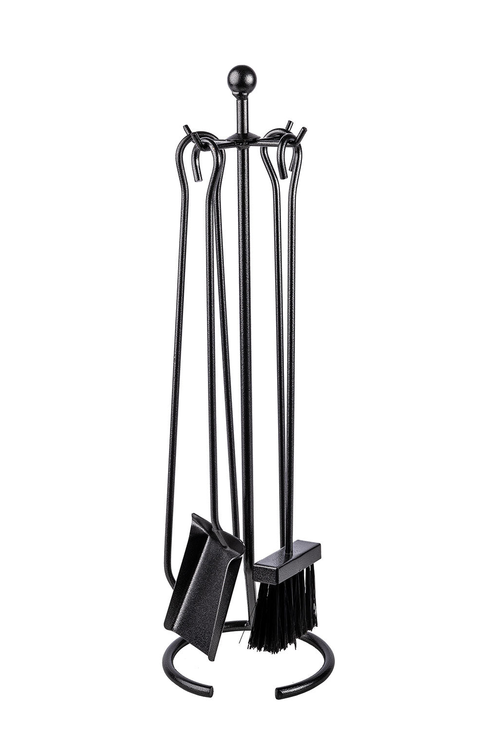 Realizzato in robusto ferro verniciato, il set è rifinito in un moderno colore grigio martellato che si abbina perfettamente sia agli ambienti rustici che a quelli contemporanei. Il trespolo tondo (diametro 12) è progettato per essere salvaspazio, fornendo un supporto stabile e discreto per tutti gli strumenti.