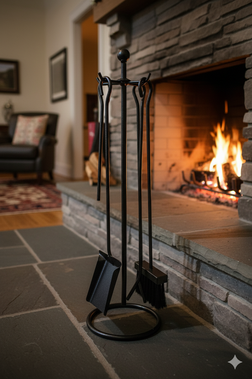• Strumenti Inclusi: Paletta per la cenere, Scopino per la pulizia, Attizzino (o gancio) per spostare la legna, Pinza per maneggiare tizzoni e ceppi